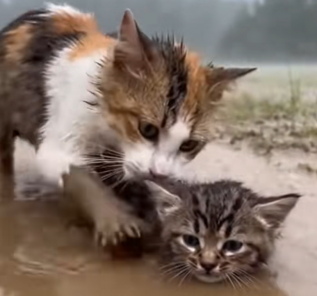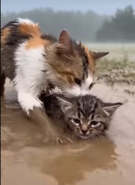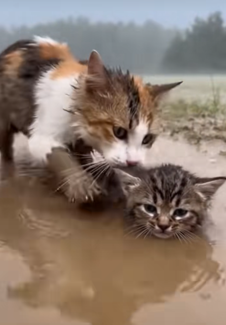 Among the ruins, a mother cat fought with every ounce of her strength. Her tiny paws dug into the thick, heavy mud as she tried to pull her kitten to safety. Each tug was a battle—not just against the muck, but against the overwhelming force of nature itself.