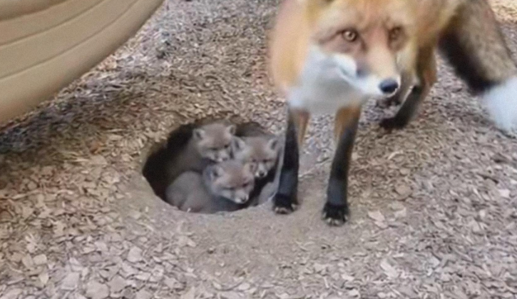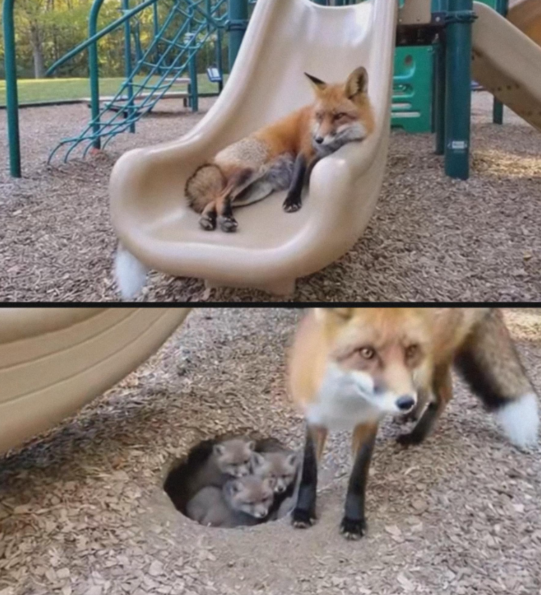 Nearby land had been cleared and disturbed, leaving fewer safe spots for wildlife. The fox had picked the one corner humans would never suspect — under the slide — as a sanctuary. What at first seemed shocking now made perfect sense: this was a mother’s instinct in action, prioritizing safety over fear, using her wits to care for her family.