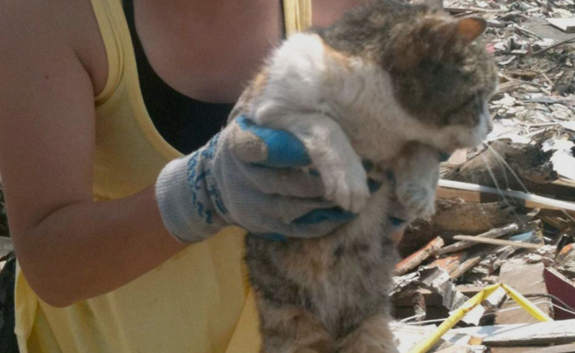 Terrla Cruse and J E Cruse went back to search for important documents and personal items, bracing themselves for the worst. Then, through the rubble, they heard it: a faint, fragile meow. Following the sound, they navigated the wreckage carefully, eventually discovering Lavern — alive.