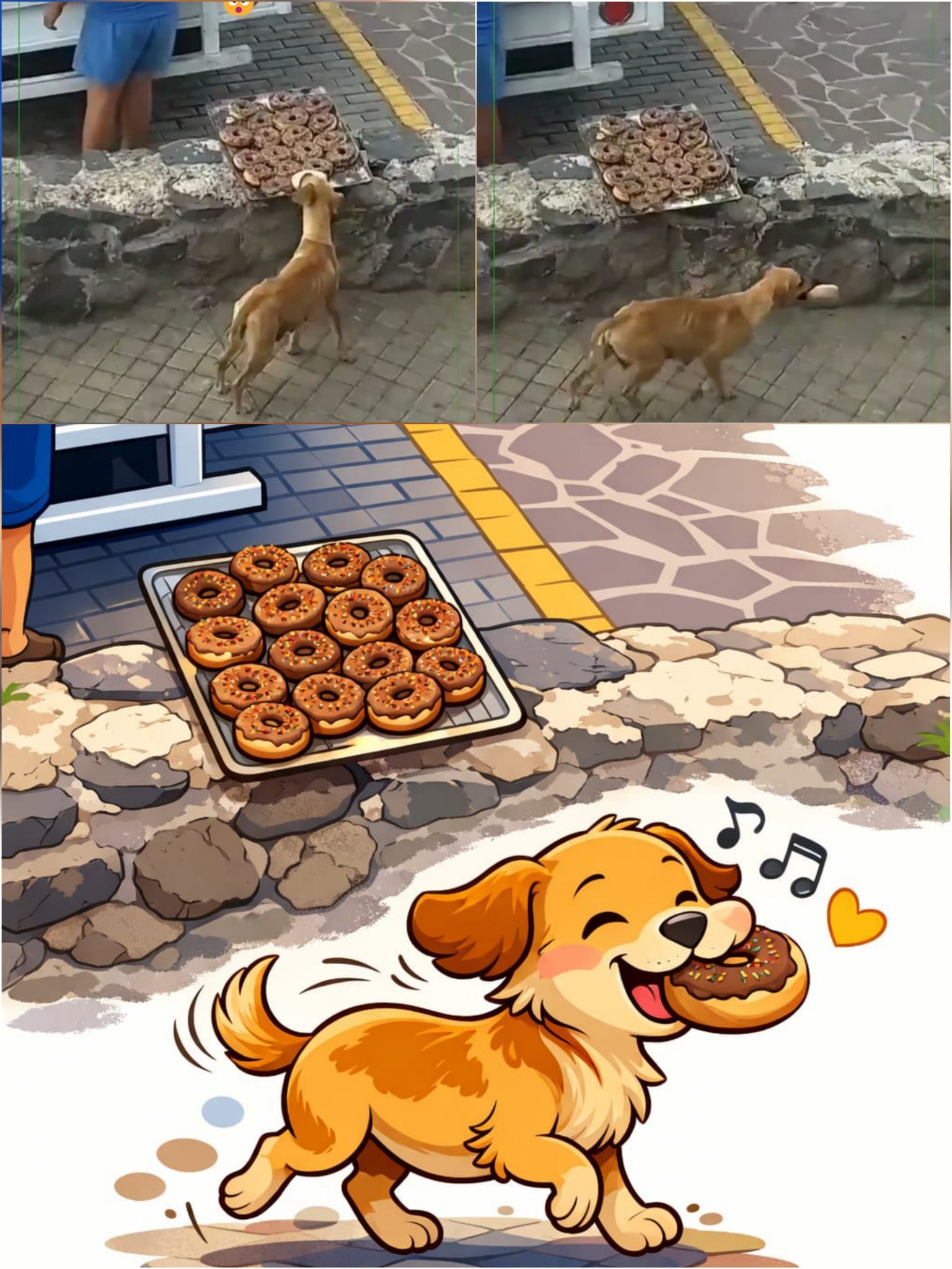 It only took a second. A small moment of distraction, a tray filled with fresh donuts left unattended… and a hungry stray who had probably been searching for food for hours 🥺