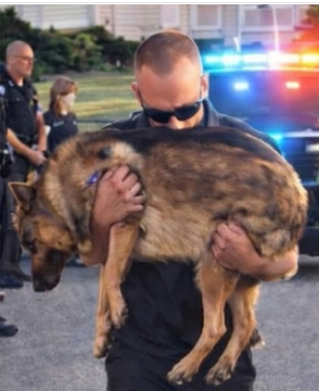 A strong officer carrying a tired dog through the flashing lights of an emergency scene reminds us of something simple but powerful: Heroism isn’t always loud.