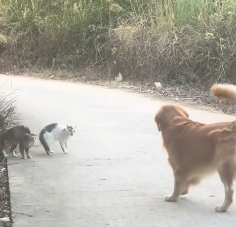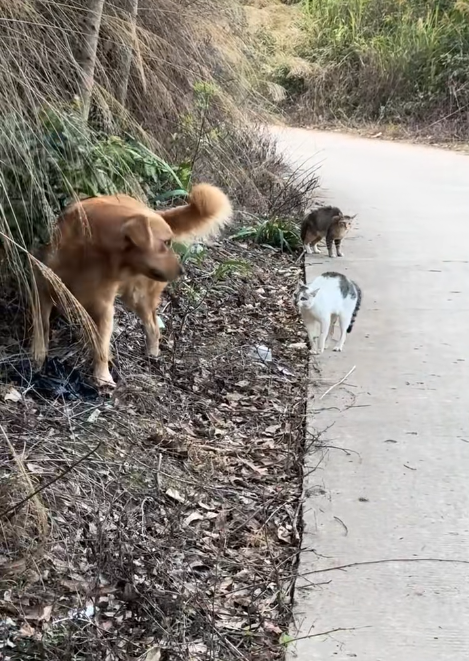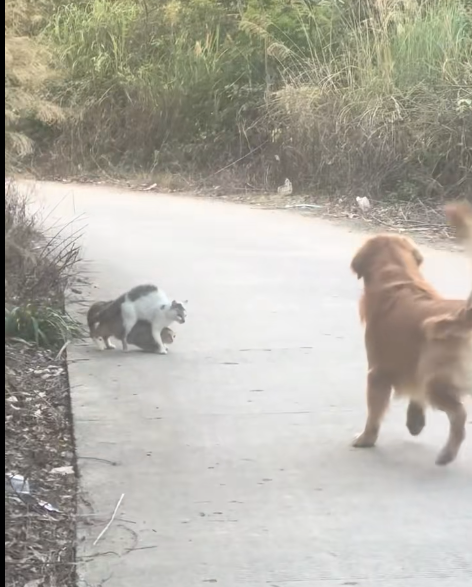 Out of nowhere, an energetic dog burst into the scene with unstoppable enthusiasm. Tail wagging wildly, paws running in every direction, it completely shattered the calm atmosphere in seconds. What had been a soft, intimate moment instantly turned into confusion and noise. The cats froze.