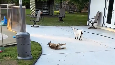 A goat is calmly standing, grazing, or simply minding its own business. The scene is peaceful, predictable, and quiet. Then, out of nowhere, something small happens — a sudden sound, a quick movement, or even just another animal getting too close.