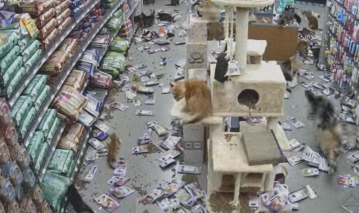 A nearby animal shelter had a minor mishap: an unattended door latch left a group of cats free to wander. Curiosity and instinct took over, and the cats slipped straight into the new pet shop next door.