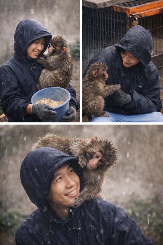 In the middle of a quiet, rain-soaked day, a little macaque clings gently to the shoulder of the one person he trusts most. No fear. No hesitation. Just closeness. His tiny body, drenched from the rain, presses in—not for shelter alone, but for something deeper: comfort.