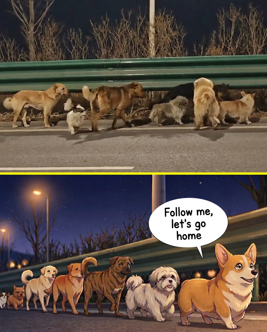 For nearly two days, the group traveled more than 17 kilometers, crossing roads and open land. Witnesses who saw them couldn’t believe what they were watching. At the front, a small Welsh Corgi led the way, walking with quiet determination as if guiding the others. Around him, the larger dogs moved carefully, staying close, almost like guardians—watching, protecting, making sure no one was left behind.