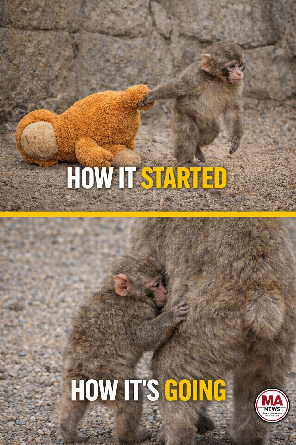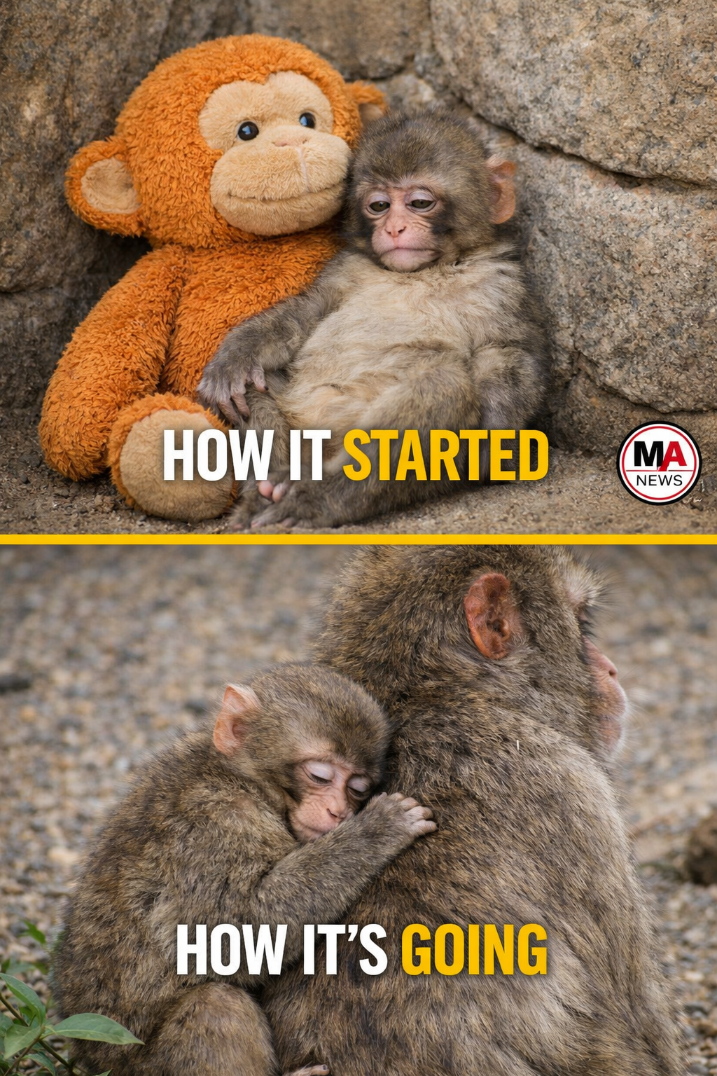 What makes this story resonate is the emotional contrast. People are not just seeing a monkey act cute. They are seeing visible change. The frightened baby who once hid behind a toy now seems secure enough to express affection in the real world. That shift feels meaningful because it suggests something deeper than maturity — it suggests healing.