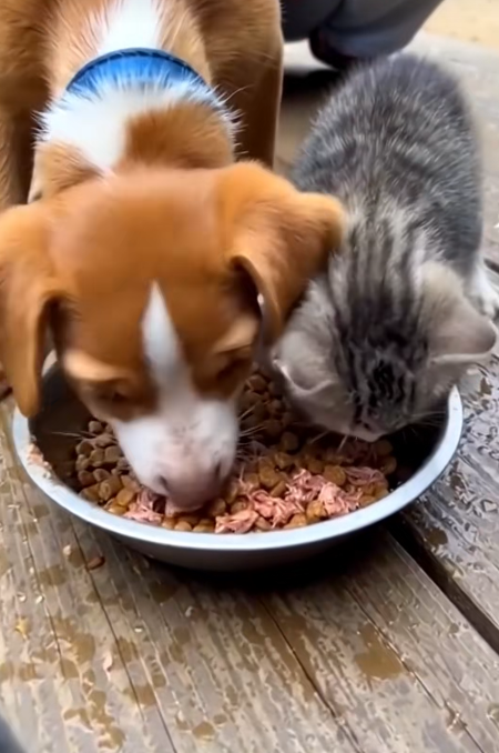The kitten grew curious, exploring its surroundings, while the puppy stayed close, wagging its tail with growing energy. Their bond remained strong — always near each other, as if remembering the storm they survived together.