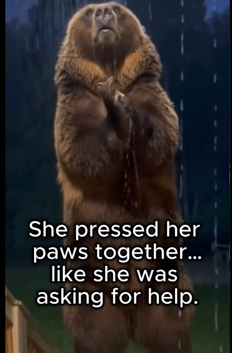 Standing just outside was a massive wild bear, her fur soaked from the rain, her breath visible in the freezing air. Every instinct told me to shut the door immediately—but something about her stopped me. She wasn’t aggressive. She wasn’t threatening. She just stood there, looking straight at me. Then I noticed what was at her feet.