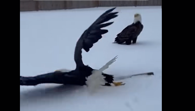 Just a few feet away stood another eagle—watching, alert, unmoving. He could have flown away at any moment. He had the strength, the freedom. But he didn’t. Every time she tried to move and stumbled, he was there—stepping closer, circling, never letting her out of his sight. It wasn’t instinct alone. It felt like something deeper. Hours passed, and still he stayed.