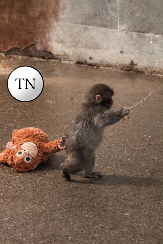 With small, careful steps and quiet determination, the little monkey drags his soft toy along the ground—sometimes in his hands, sometimes gently held in his mouth.