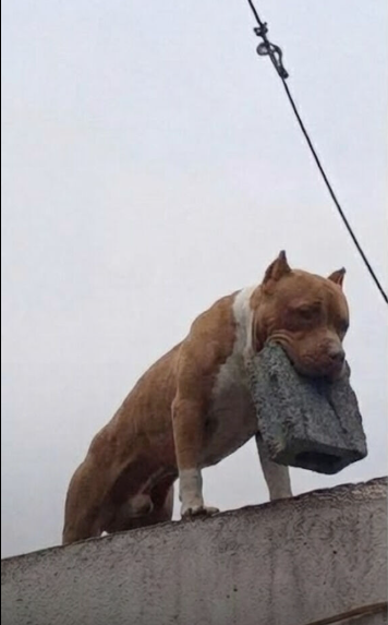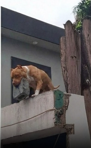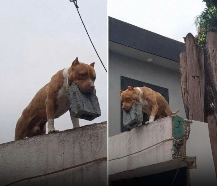 Photos that spread rapidly across social media showed the dog standing on a wall, holding a brick in its mouth, watching the entrance below. The image alone was enough to shock thousands of viewers, sparking both disbelief and concern. 😳📸