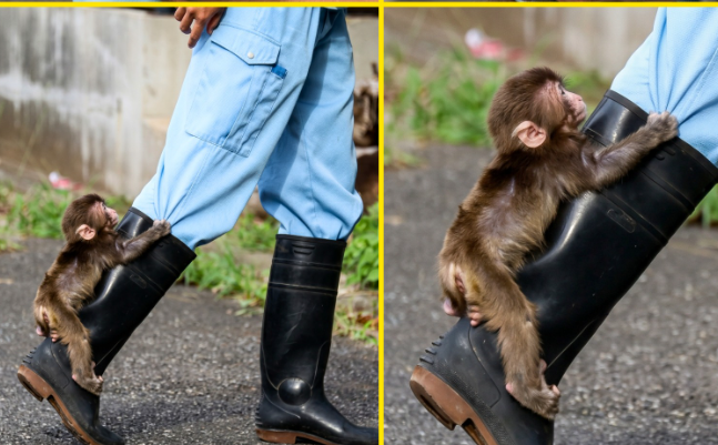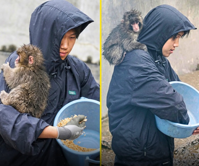 Because if you look closely, it’s clear he’s not being placed there. He climbs up on his own. He stays there because he wants to. Whether his dad is working, walking through the enclosure, or even standing in the rain, Punchy remains close — calm, quiet, and completely at ease.