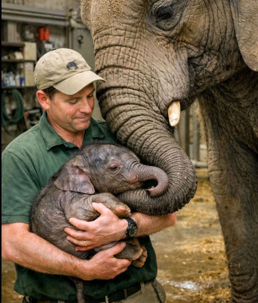 A caretaker cradles a tiny baby elephant in his arms, supporting its small, fragile body with careful strength. The little one rests peacefully, its trunk softly curled inward—a sign of trust, of comfort, of feeling safe enough to let go.