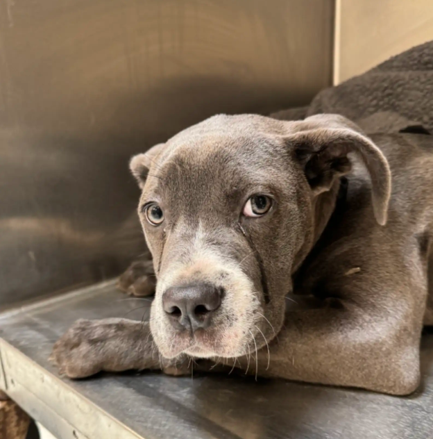 She was left tied to a pole outside the Pennsylvania SPCA. Morning came slowly, the light revealing a quiet, uncertain figure—a gray dog standing alone, unsure of where she was or why she had been left there. There was no one beside her. No familiar voice. Just a short note, attached like the only explanation she would ever get.