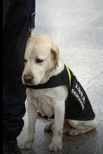 A Labrador search dog rests quietly against the officer’s leg, wearing a working vest clearly marked with the words “Search Dog.” The dog remains close, relaxed but alert, ready to respond at any moment if needed.