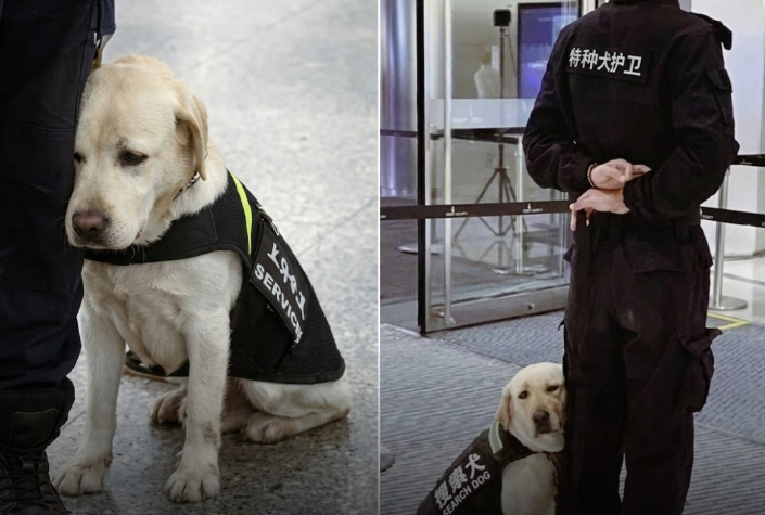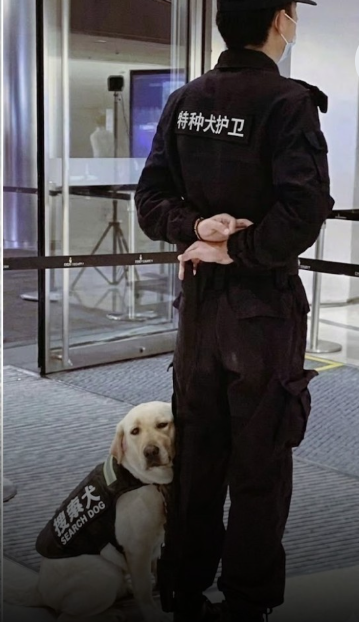 In busy places where safety matters most, there are often unseen teams quietly working to keep people protected. Among them are specially trained search dogs and their handlers — partners who rely on trust, discipline, and years of training together. 🐶🛡️ In this moment, a security officer stands calmly at an entrance, hands folded behind his back as he watches the surroundings. His posture is steady and professional, focused on the responsibility of maintaining safety in a public space.