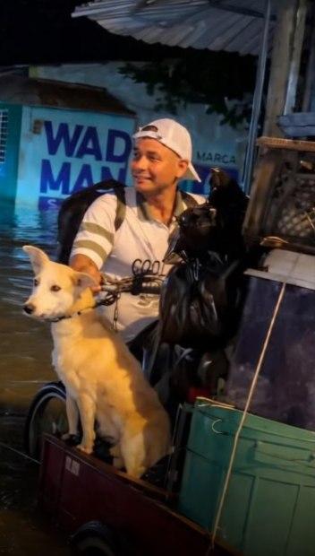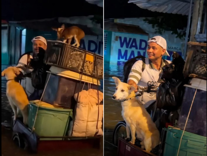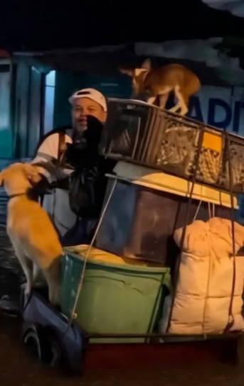 Instead of filling his vehicle with household items, he carefully placed a few essentials aside and focused on something far more important β making sure his dogs were safe. One by one, he helped them climb onto the tricycle, gently arranging them so they could sit securely above the rising water.