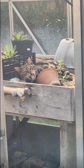 Cats are famous for their ability to turn the simplest moments into something unforgettable. This particular cat seemed both relaxed and slightly annoyed at the same time — a classic feline combination. Its posture suggested it had been lounging comfortably among the garden items for quite some time, enjoying the quiet space.