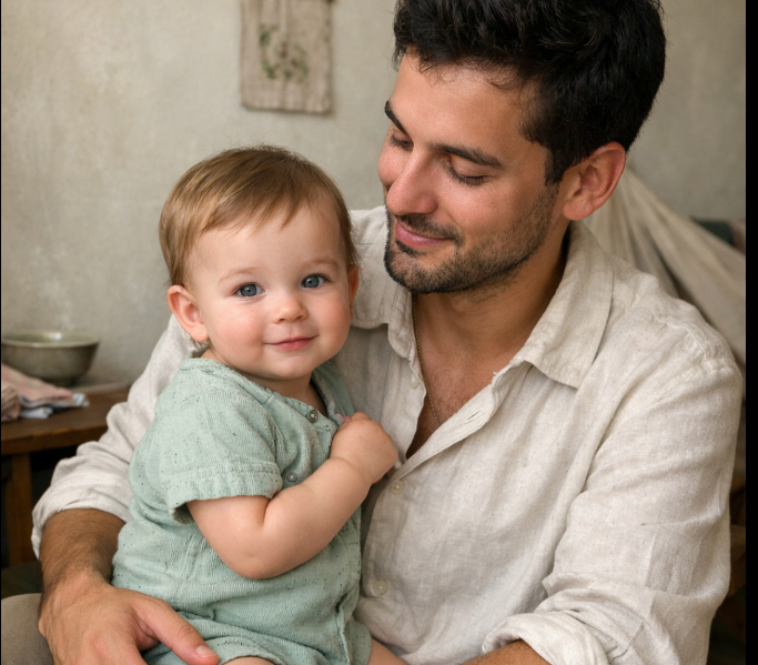 Little Lina sat in her father’s arms, her tiny fingers reaching curiously toward the flickering candle. To her, this was just a moment of light, color, and warmth. She smiled without knowing the weight behind it. But her father knew.